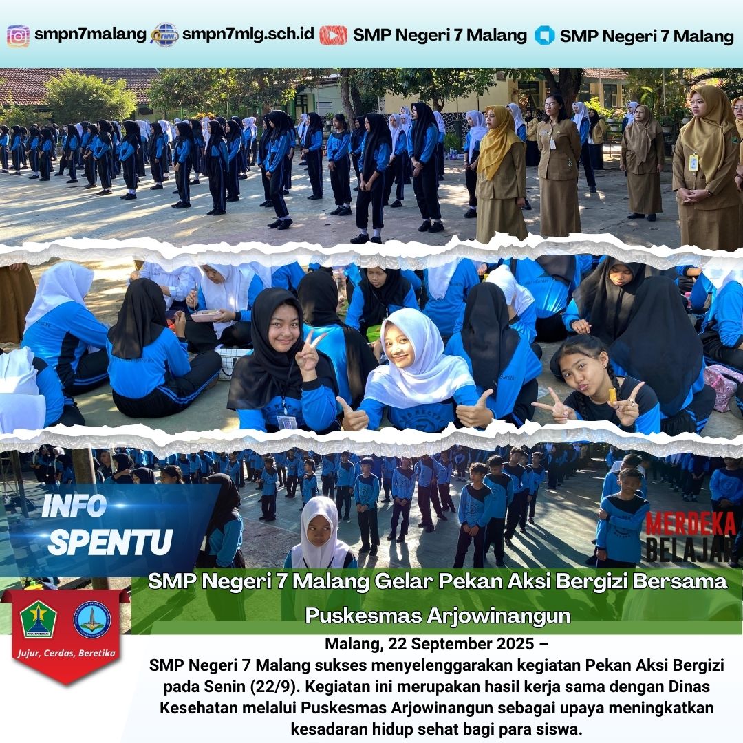 Malang, 22 September 2025 – SMP Negeri 7 Malang sukses menyelenggarakan kegiatan Pekan Aksi Bergizi pada Senin (22/9). Kegiatan ini merupakan hasil kerja sama dengan Dinas Kesehatan melalui Puskesmas Arjowinangun …