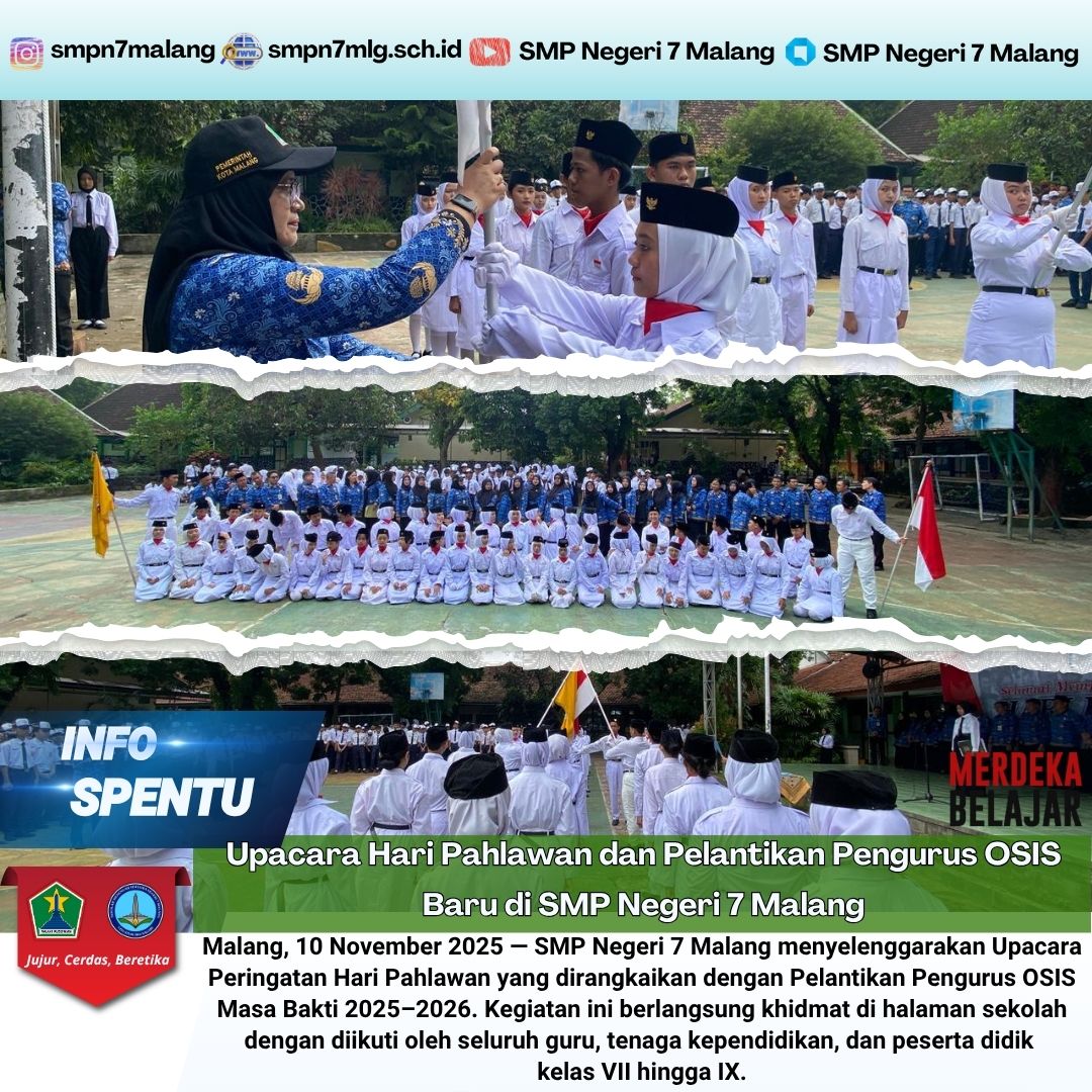 Malang, 10 November 2025 — SMP Negeri 7 Malang menyelenggarakan Upacara Peringatan Hari Pahlawan yang dirangkaikan dengan Pelantikan Pengurus OSIS Masa Bakti 2025–2026. Kegiatan ini berlangsung khidmat di halaman sekolah …